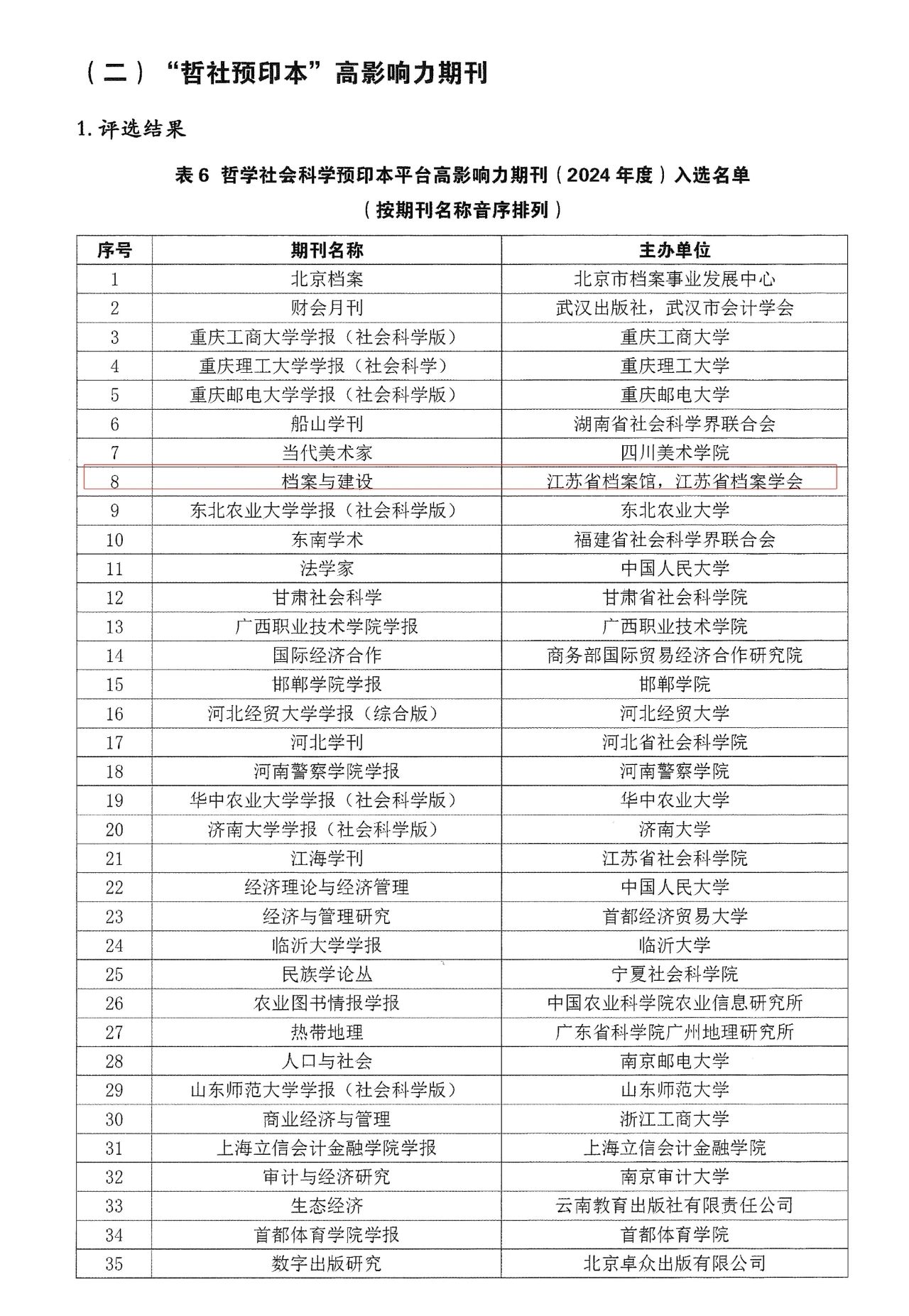 2025年4月19日,由中国人民大学书报资料中心、中国科学院文献情报中心、中国科学技术情报学会开放科学专业委员会联合举办的“2025年复印报刊资料转载指数发布暨预印本平台建设论坛”在北京召开。会议公布了2024年度“哲学社会科学预印本平台高影响力期刊”50强,《档案与建设》期刊成功入选该名录。